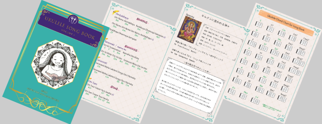 冊子には全ての曲の歌詞、コード、神話の小話、ウクレレコード表がついています。